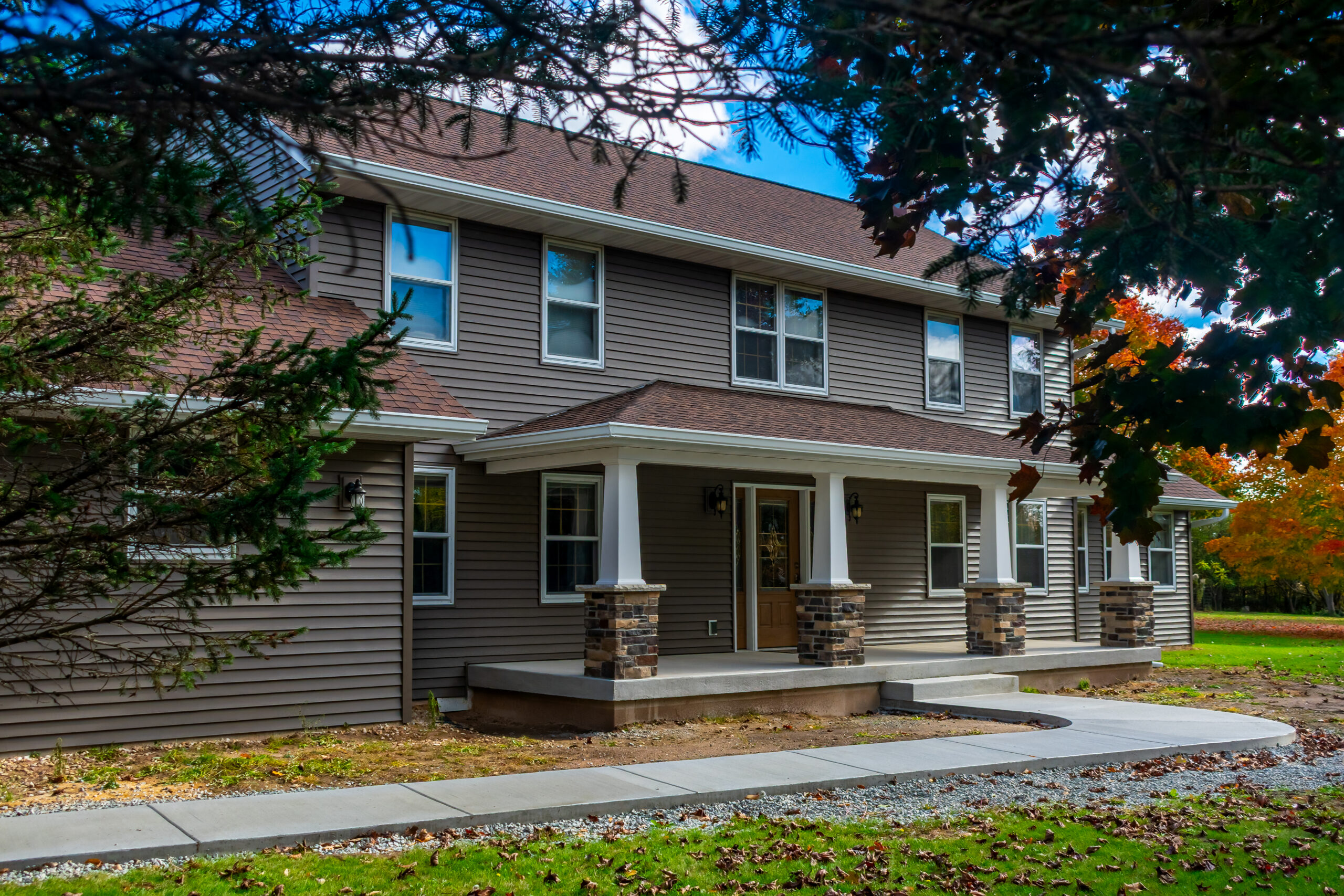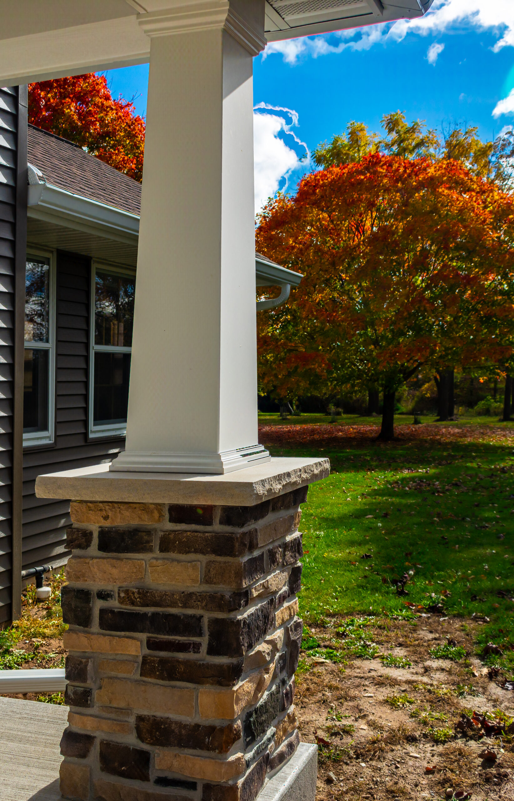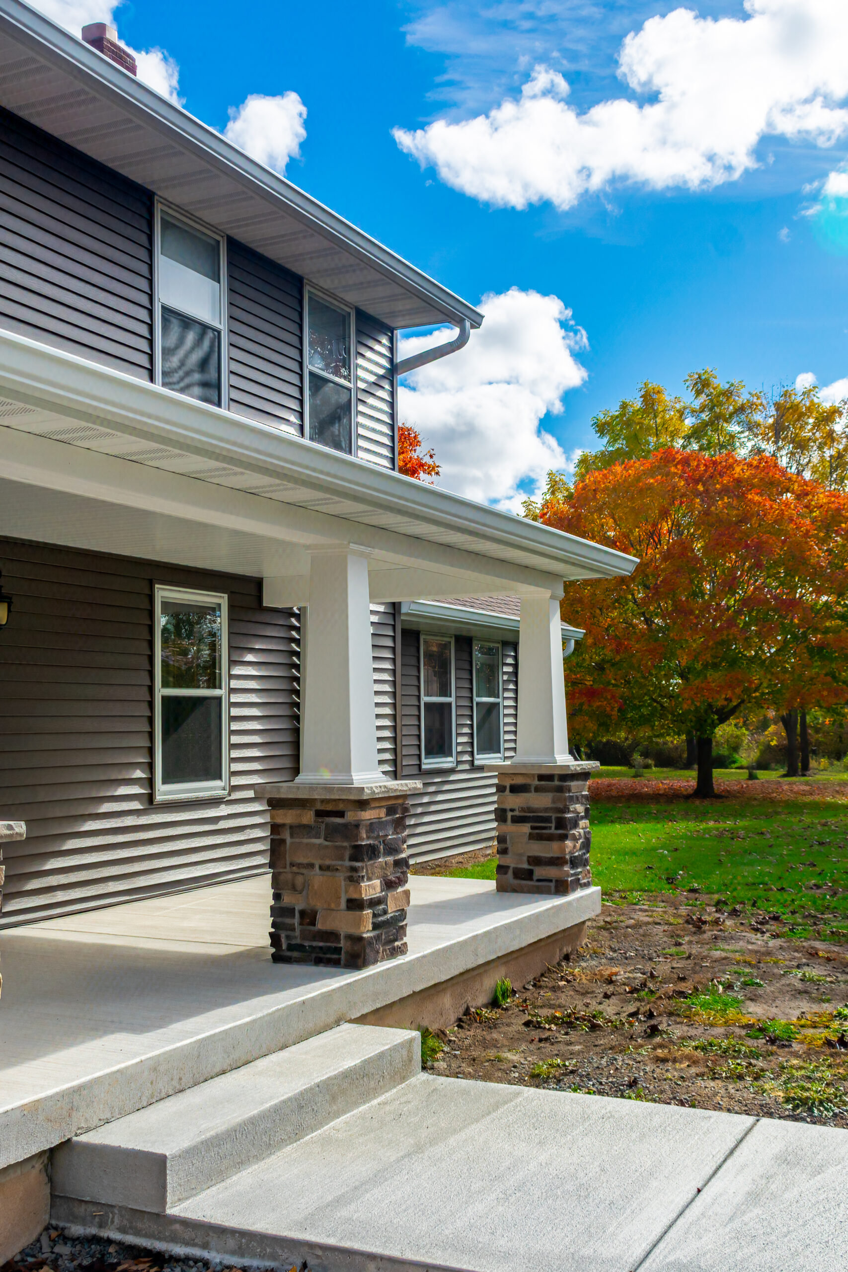The Autumn Watch is a refined exterior transformation that brings new life to a home already rooted in its surroundings. Warm siding, crisp white trim, and stone-accented columns work together to create a look that feels both timeless and refreshed.