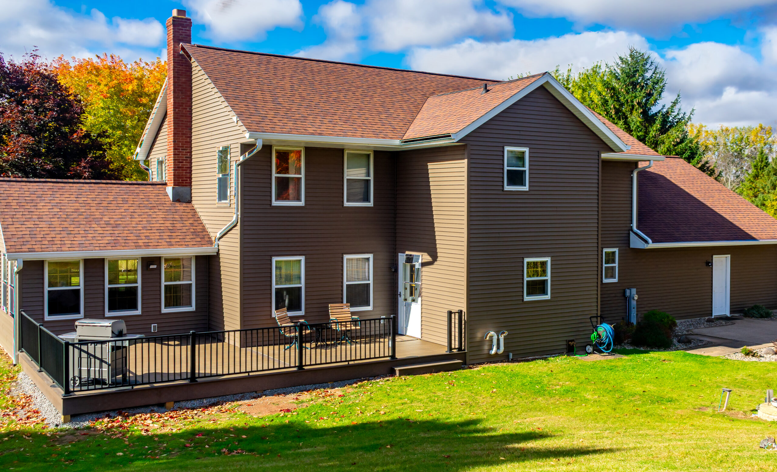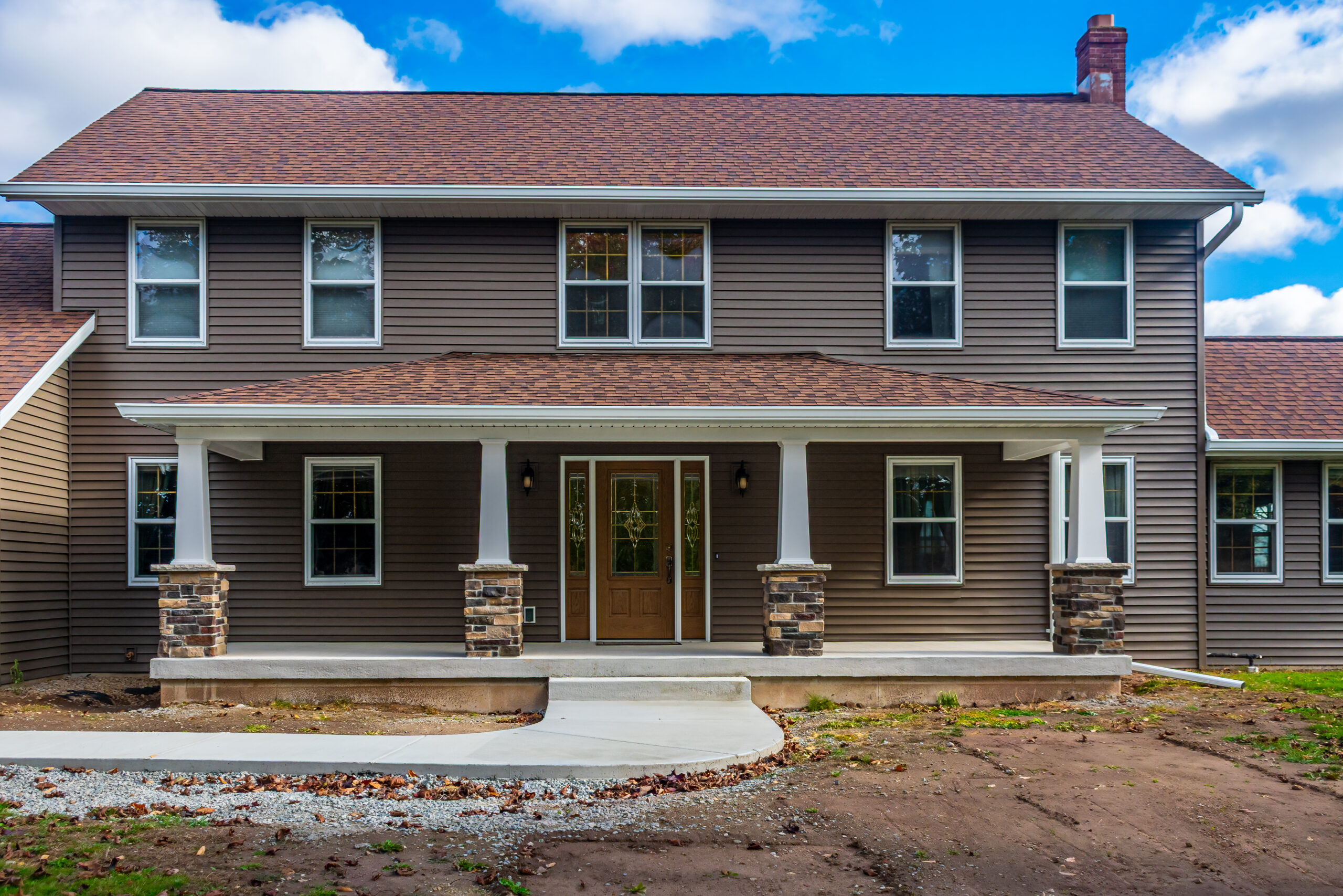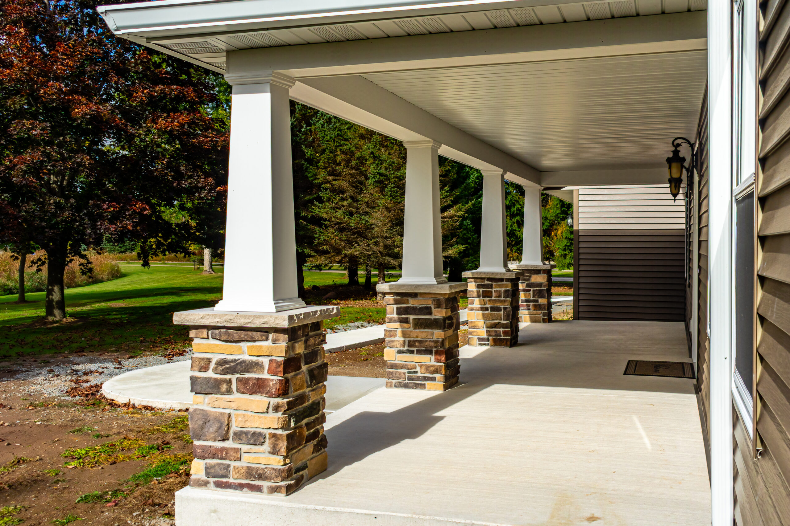 The Autumn Watch is a refined exterior transformation that brings new life to a home already rooted in its surroundings. Warm siding, crisp white trim, and stone-accented columns work together to create a look that feels both timeless and refreshed.
