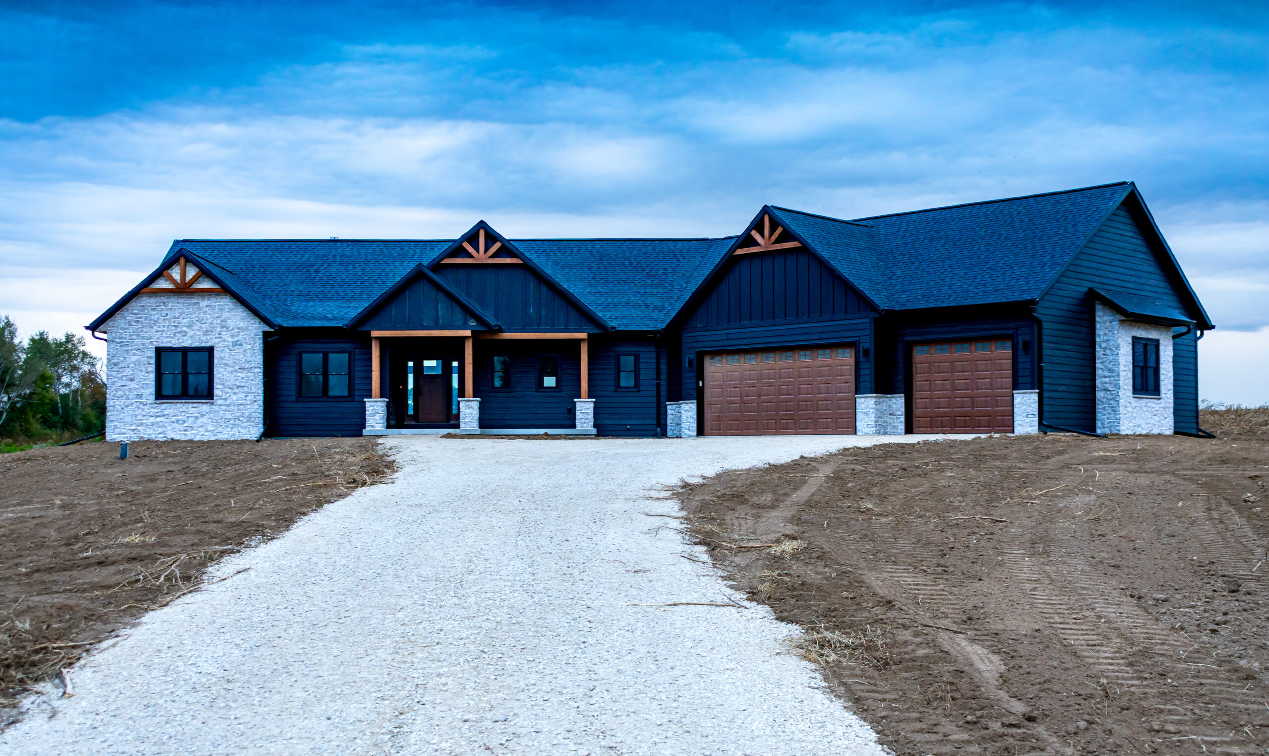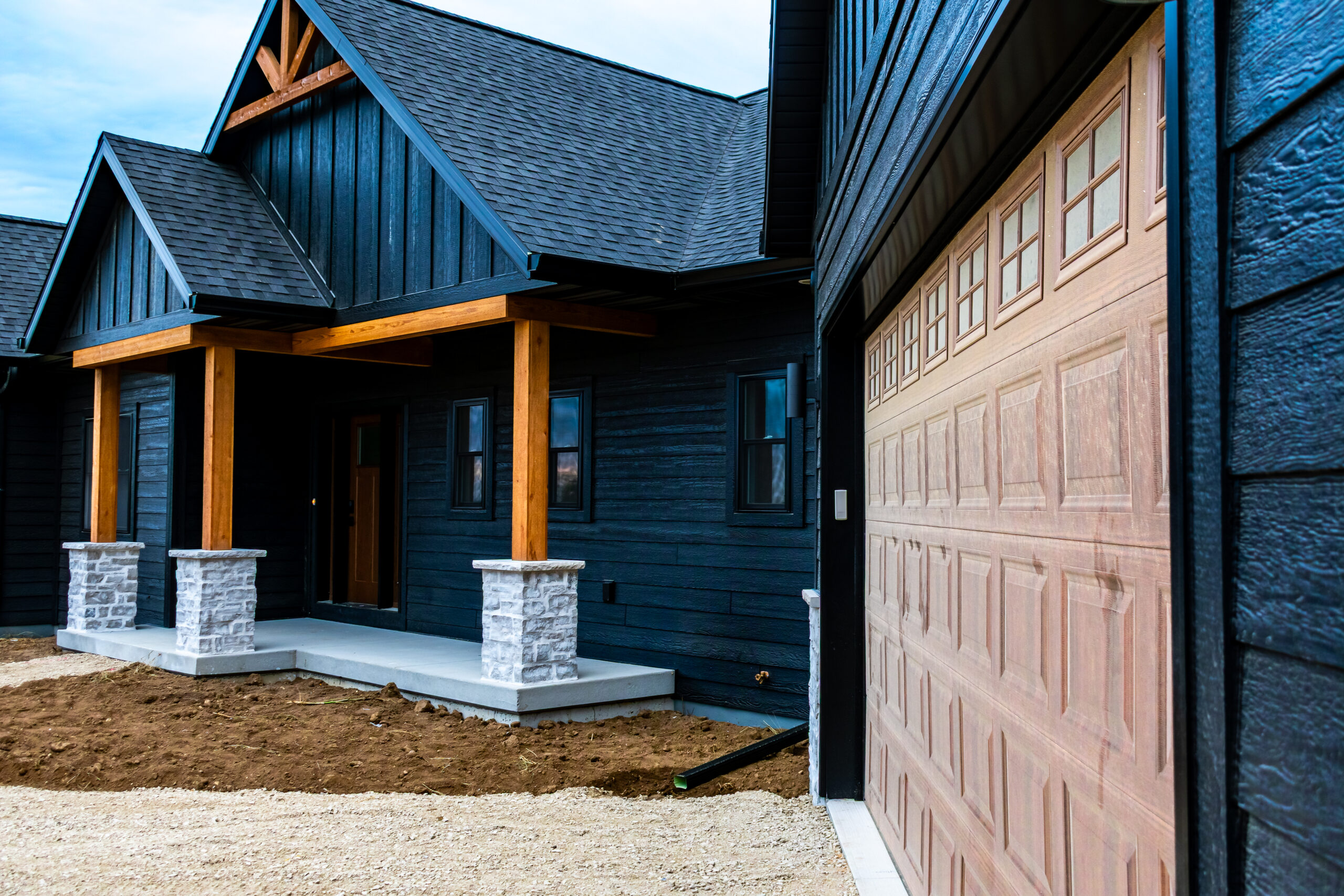 The Blackwood is a modern-meets-rustic custom home designed with contrast, warmth, and simplicity in mind. Clad in matte black siding with natural timber accents and stone details, this home stands confidently against its wide-open landscape—capturing both a bold presence and a welcoming charm. Large gabled peaks, wood columns, and expansive windows create a striking exterior that feels timeless and elevated.