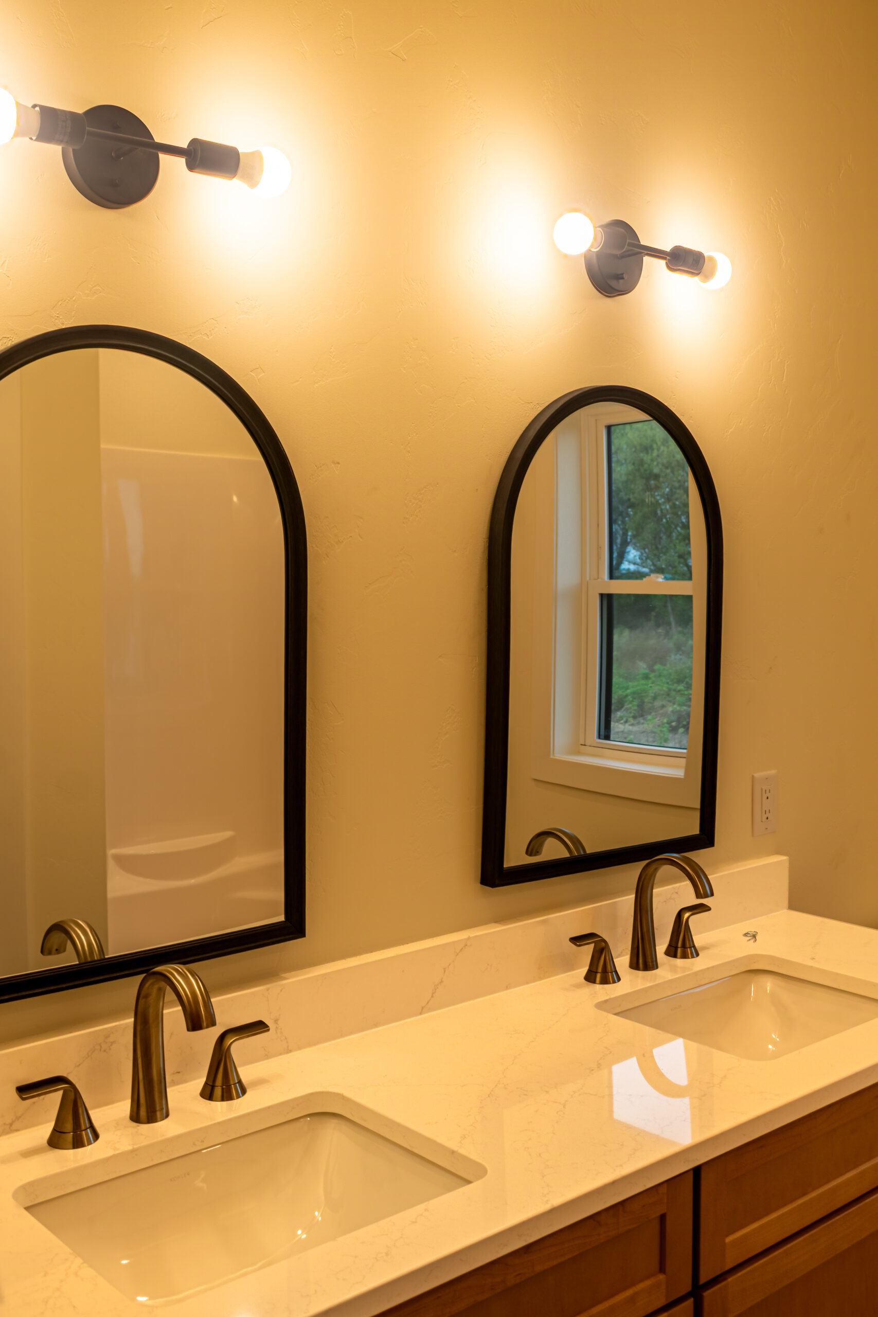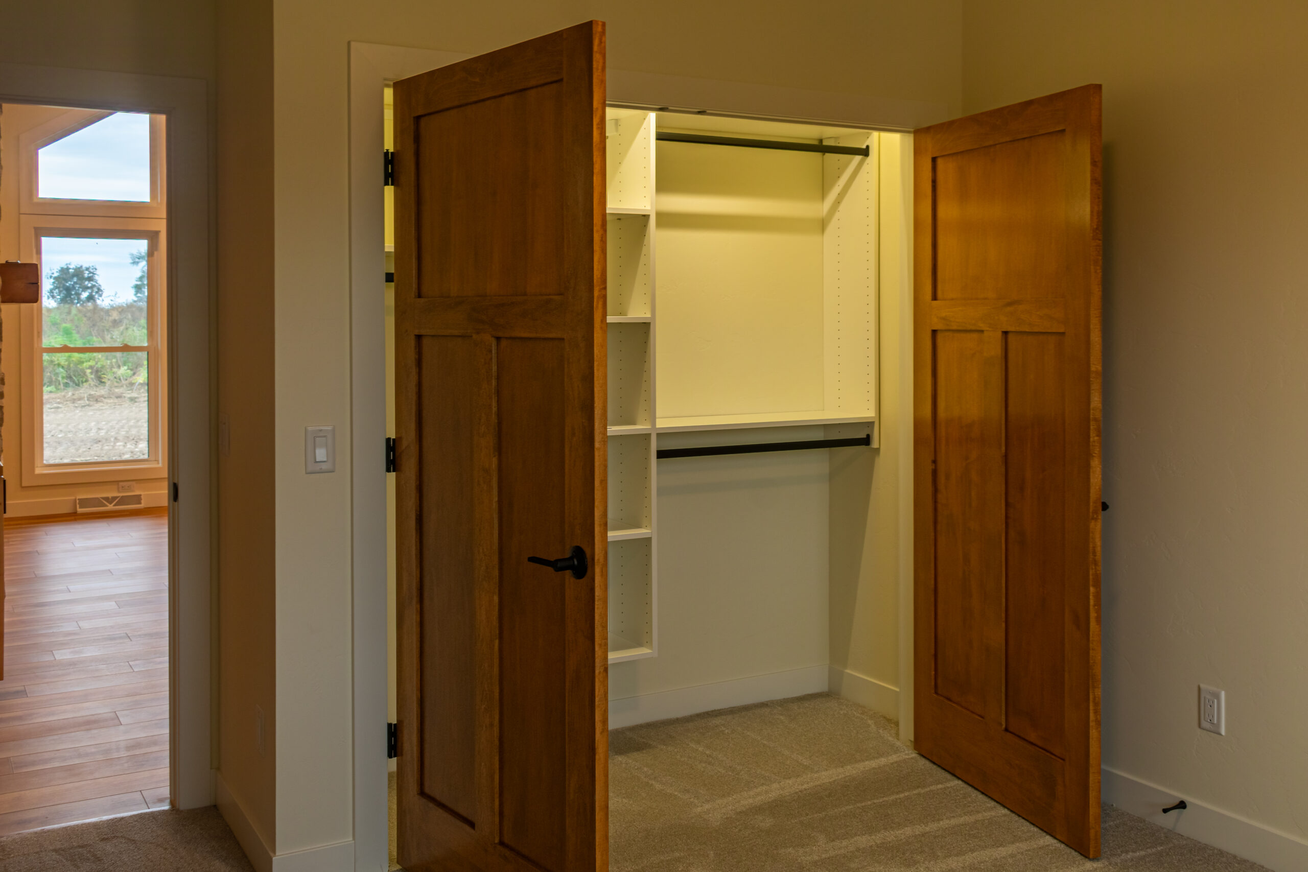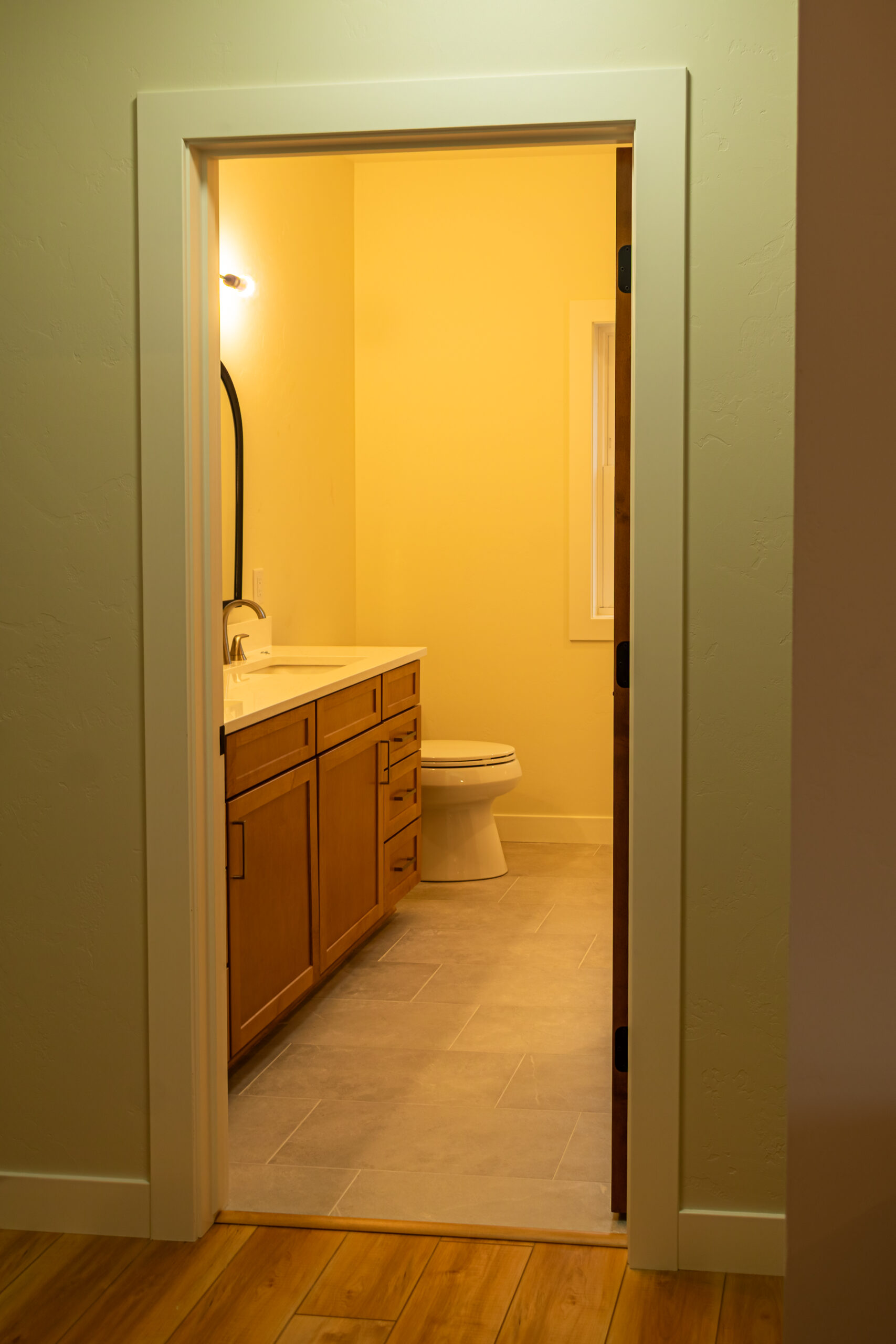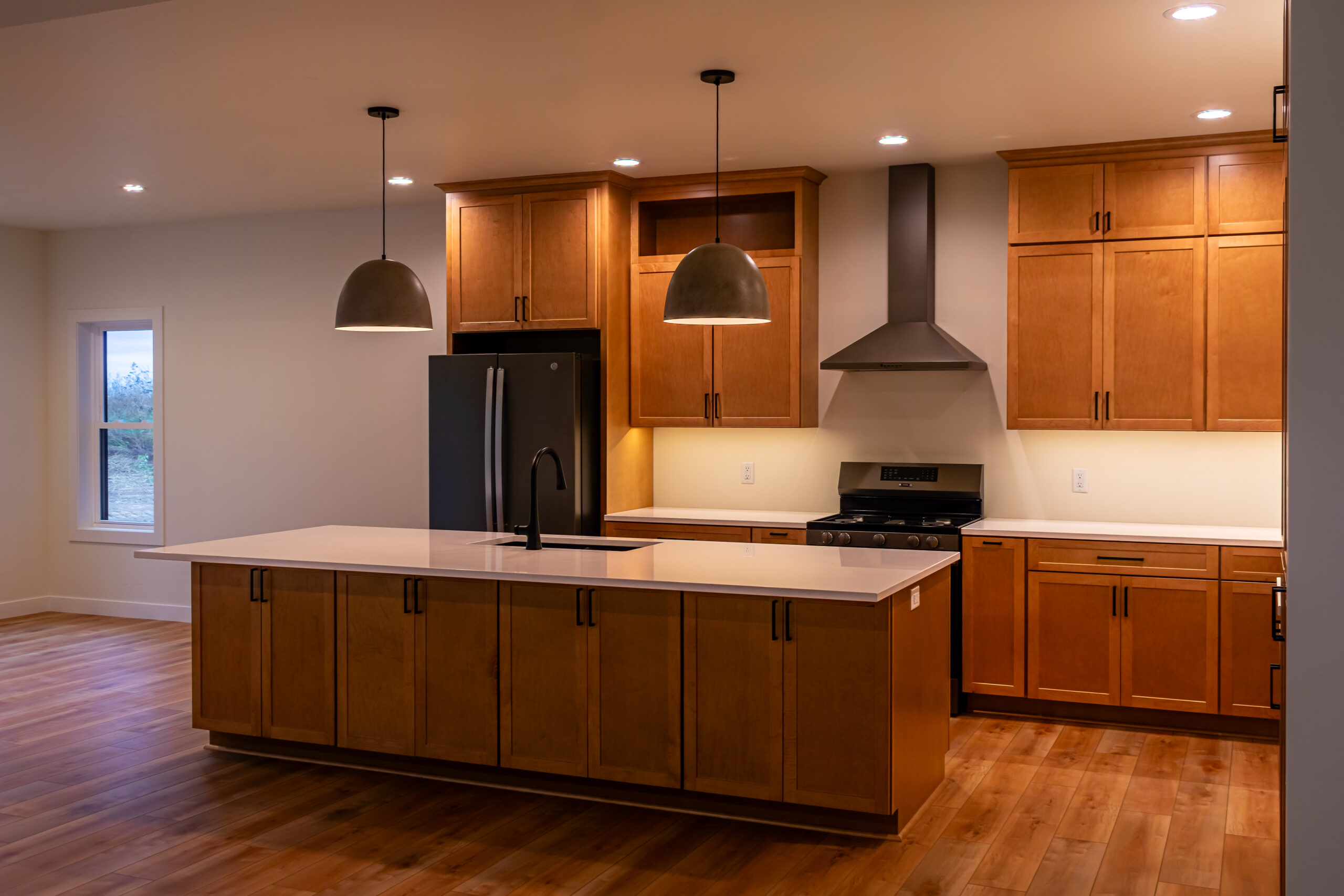 Inside, The Blackwood continues its warm and grounded palette with natural wood cabinetry, durable flooring, and black fixtures that add definition and sophistication throughout the space. The centrally located stone fireplace anchors the living room while vaulted ceilings and floor-to-ceiling windows frame scenic views and flood the home with natural light.