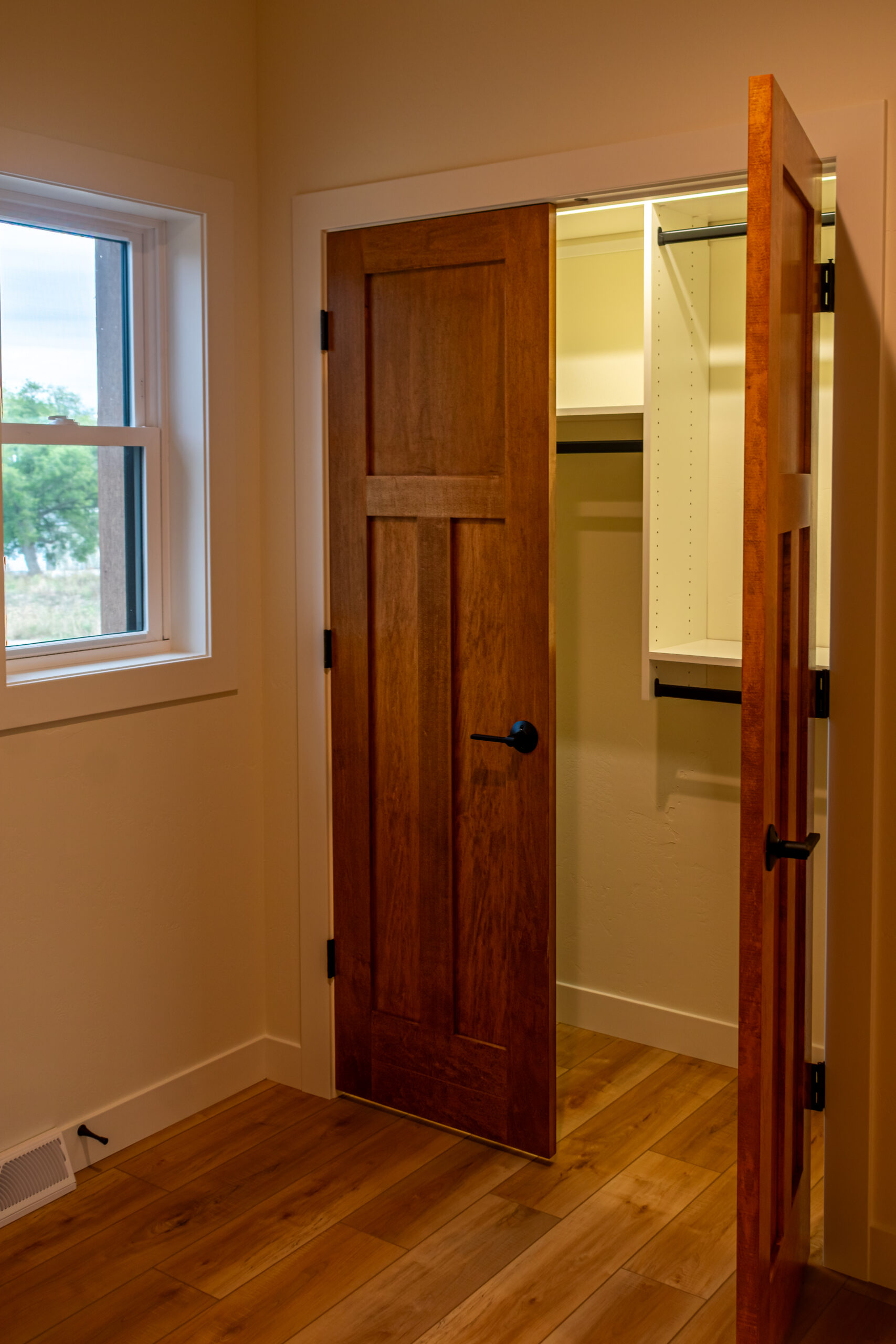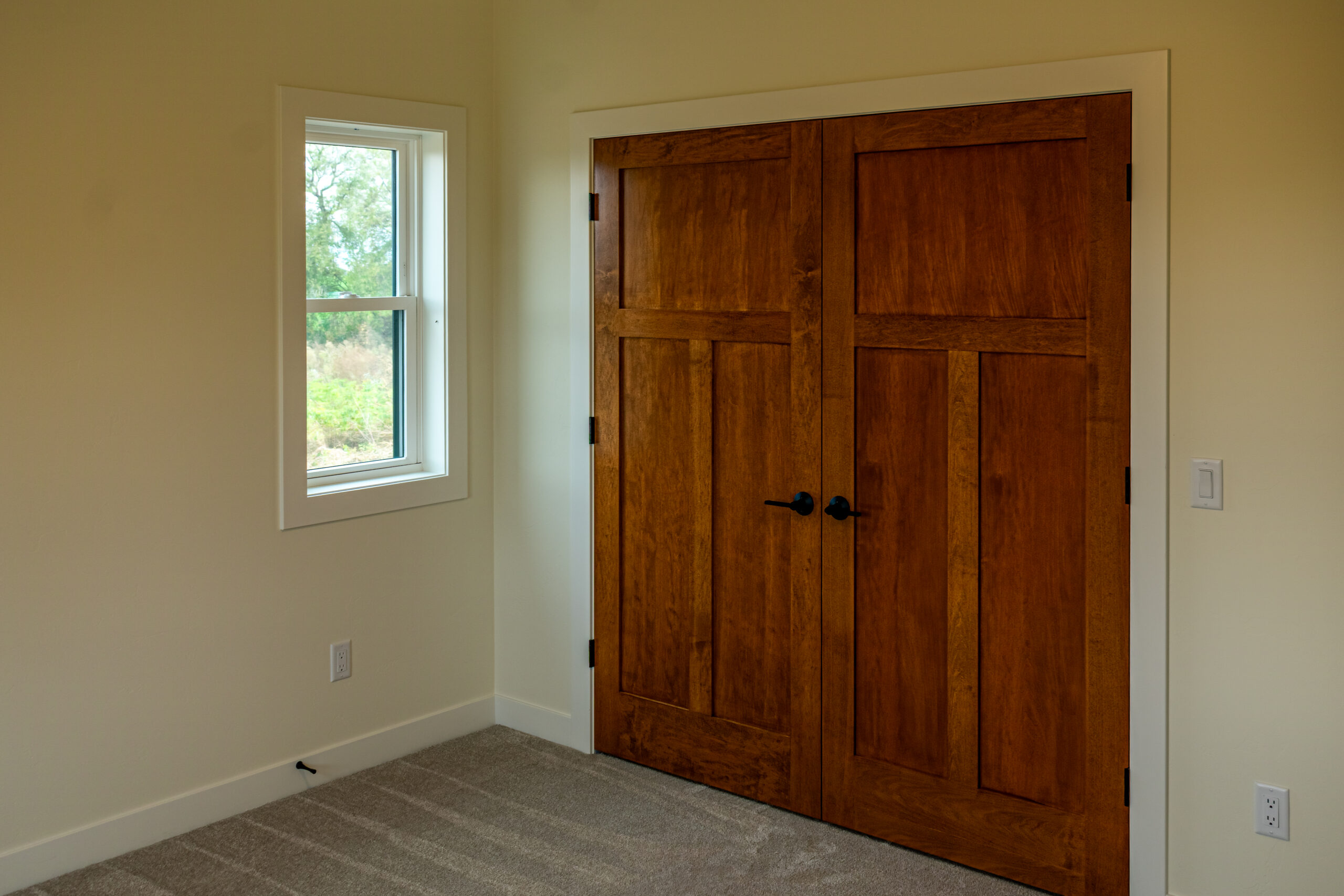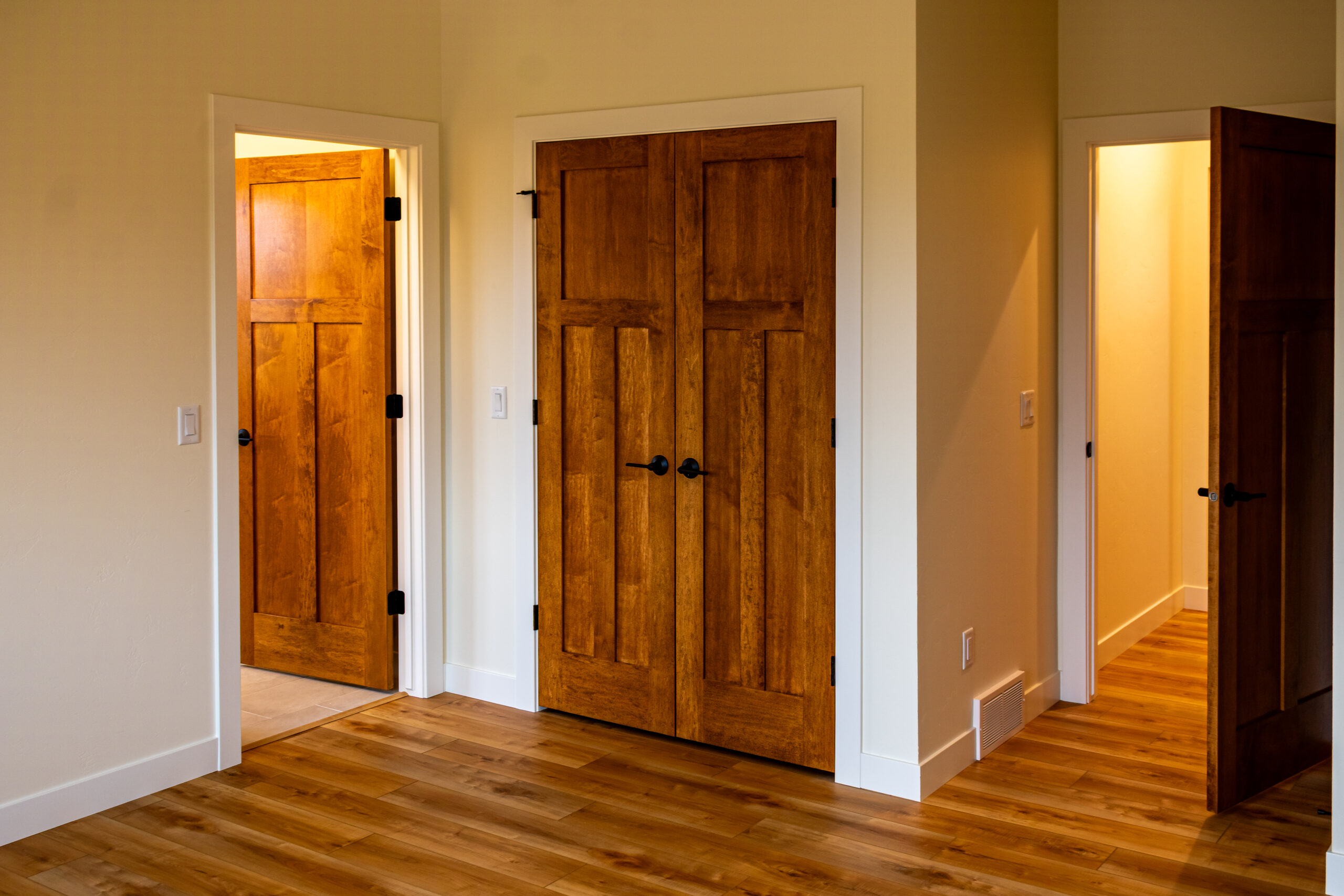Inside, The Blackwood continues its warm and grounded palette with natural wood cabinetry, durable flooring, and black fixtures that add definition and sophistication throughout the space. The centrally located stone fireplace anchors the living room while vaulted ceilings and floor-to-ceiling windows frame scenic views and flood the home with natural light.