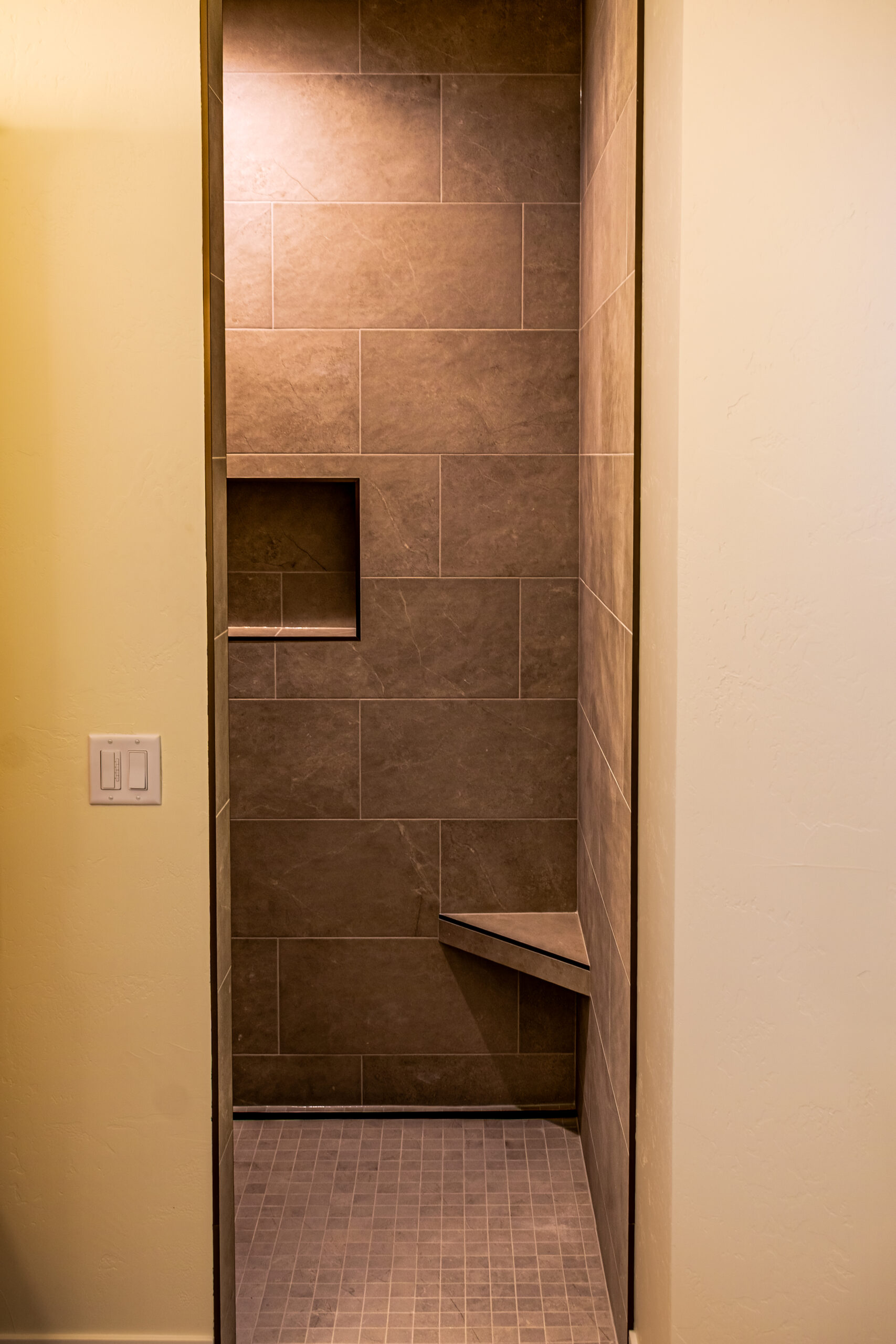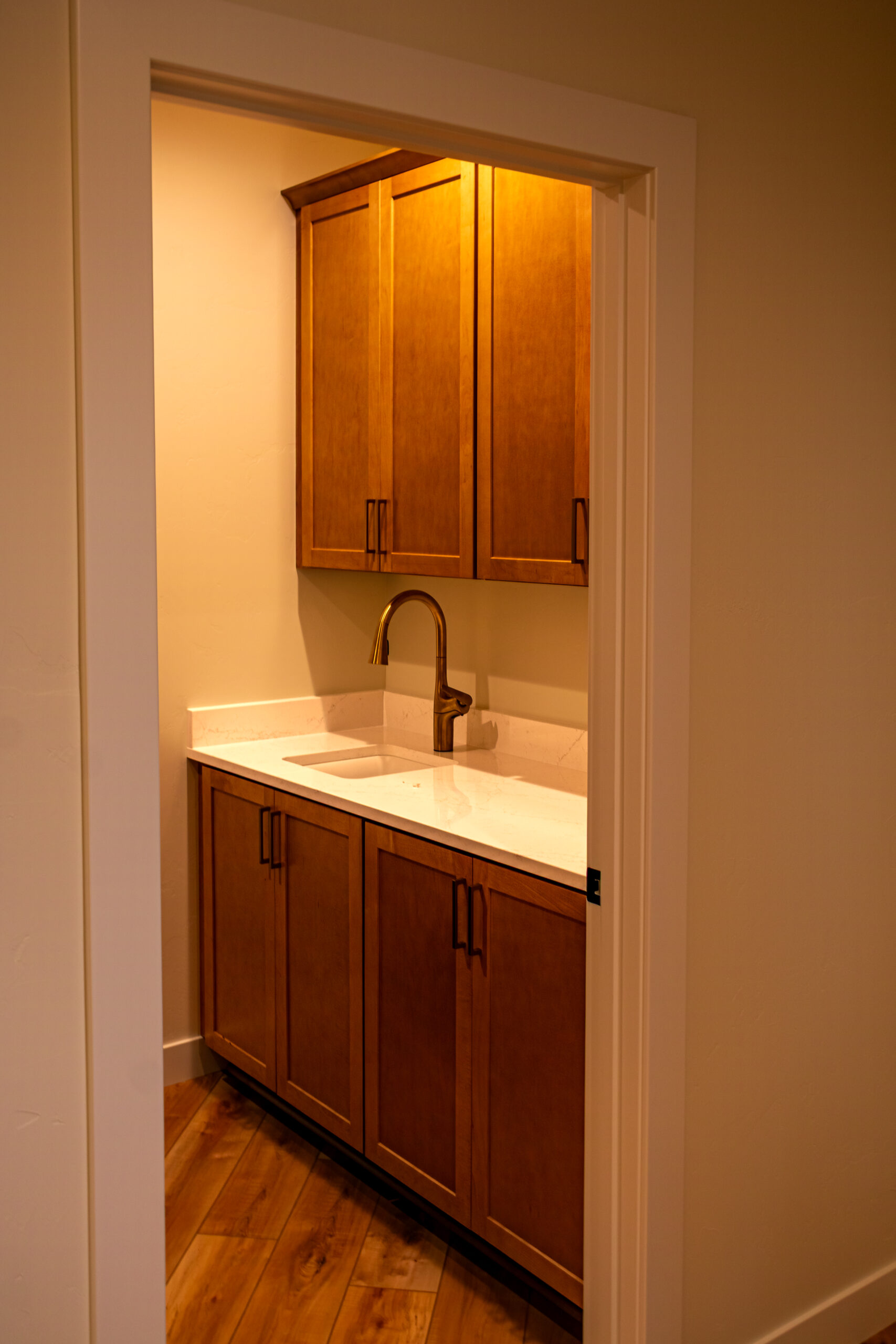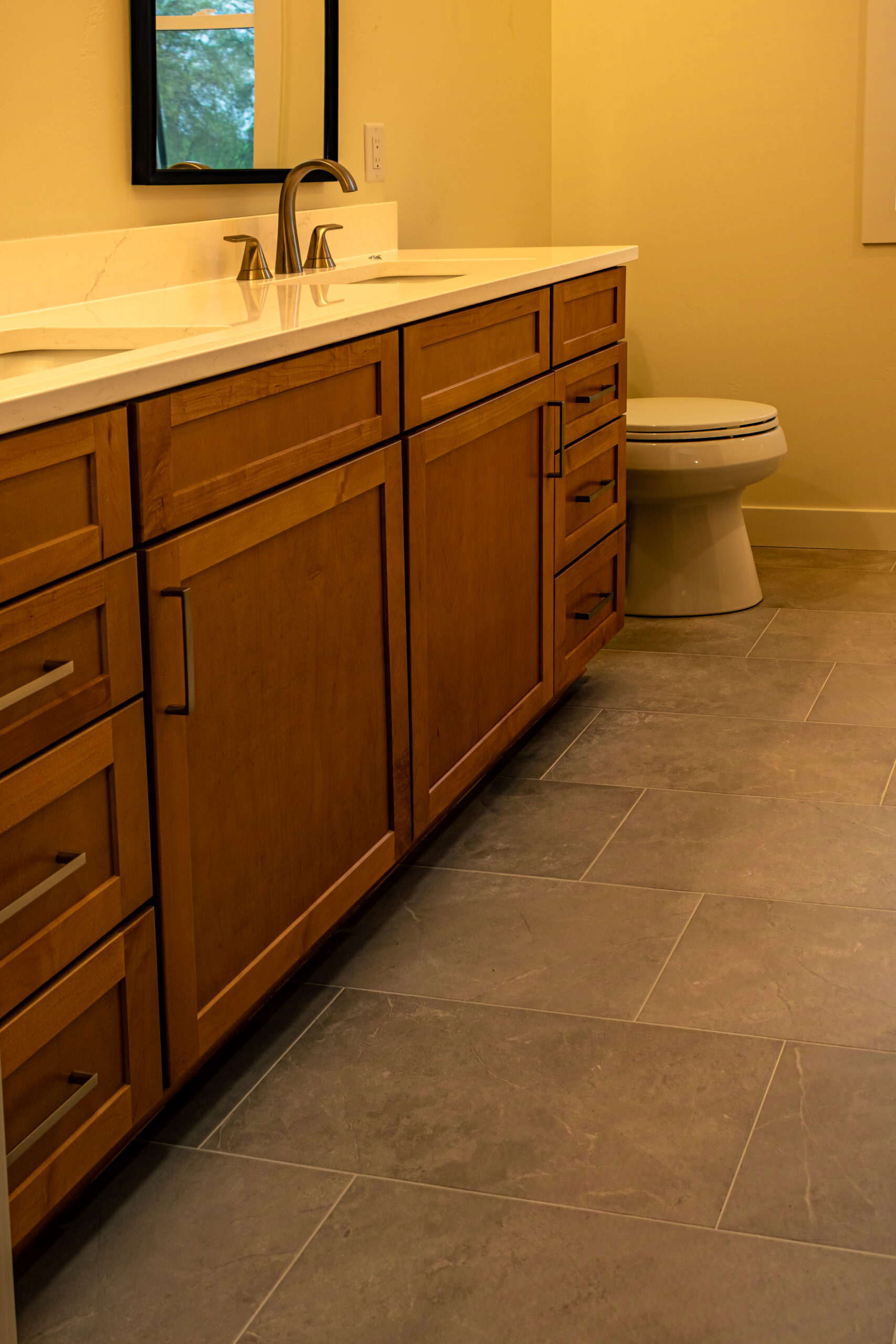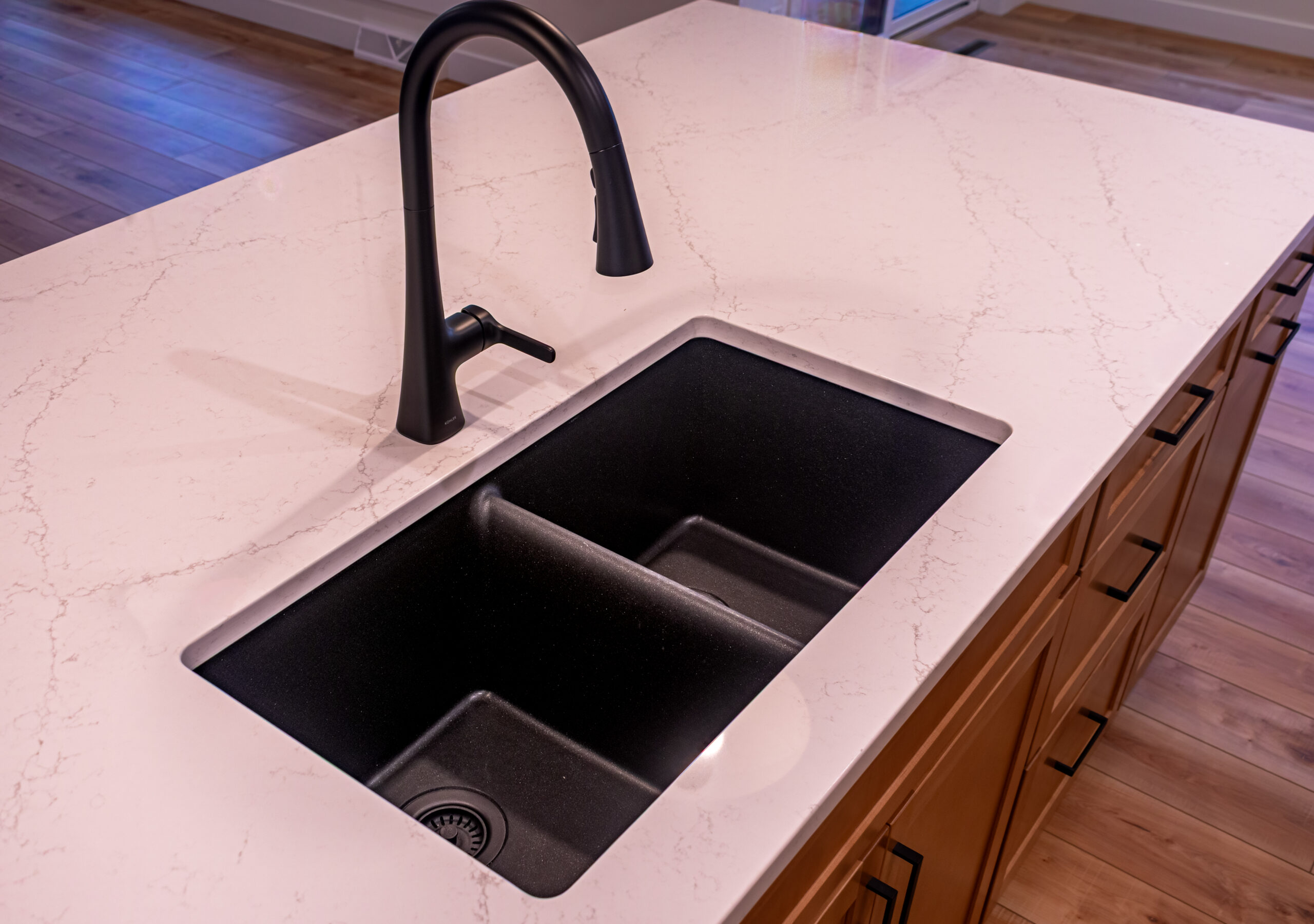 Inside, The Blackwood continues its warm and grounded palette with natural wood cabinetry, durable flooring, and black fixtures that add definition and sophistication throughout the space. The centrally located stone fireplace anchors the living room while vaulted ceilings and floor-to-ceiling windows frame scenic views and flood the home with natural light.