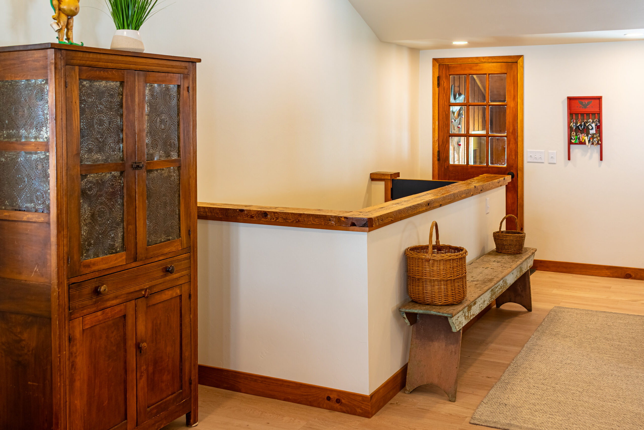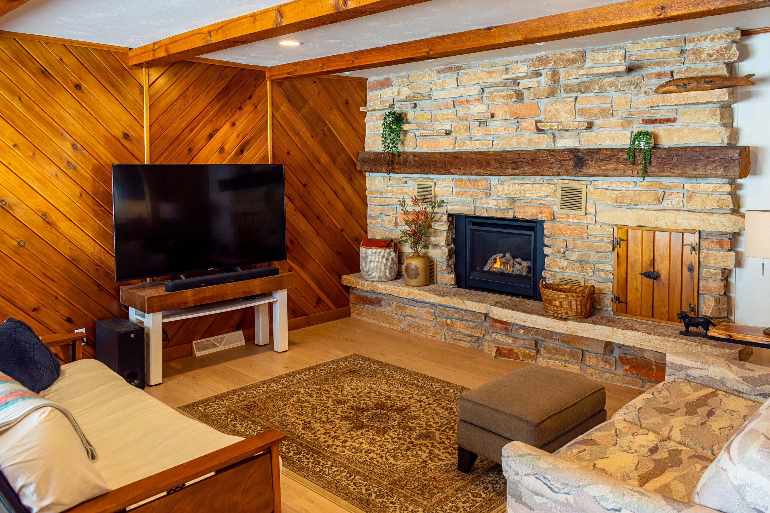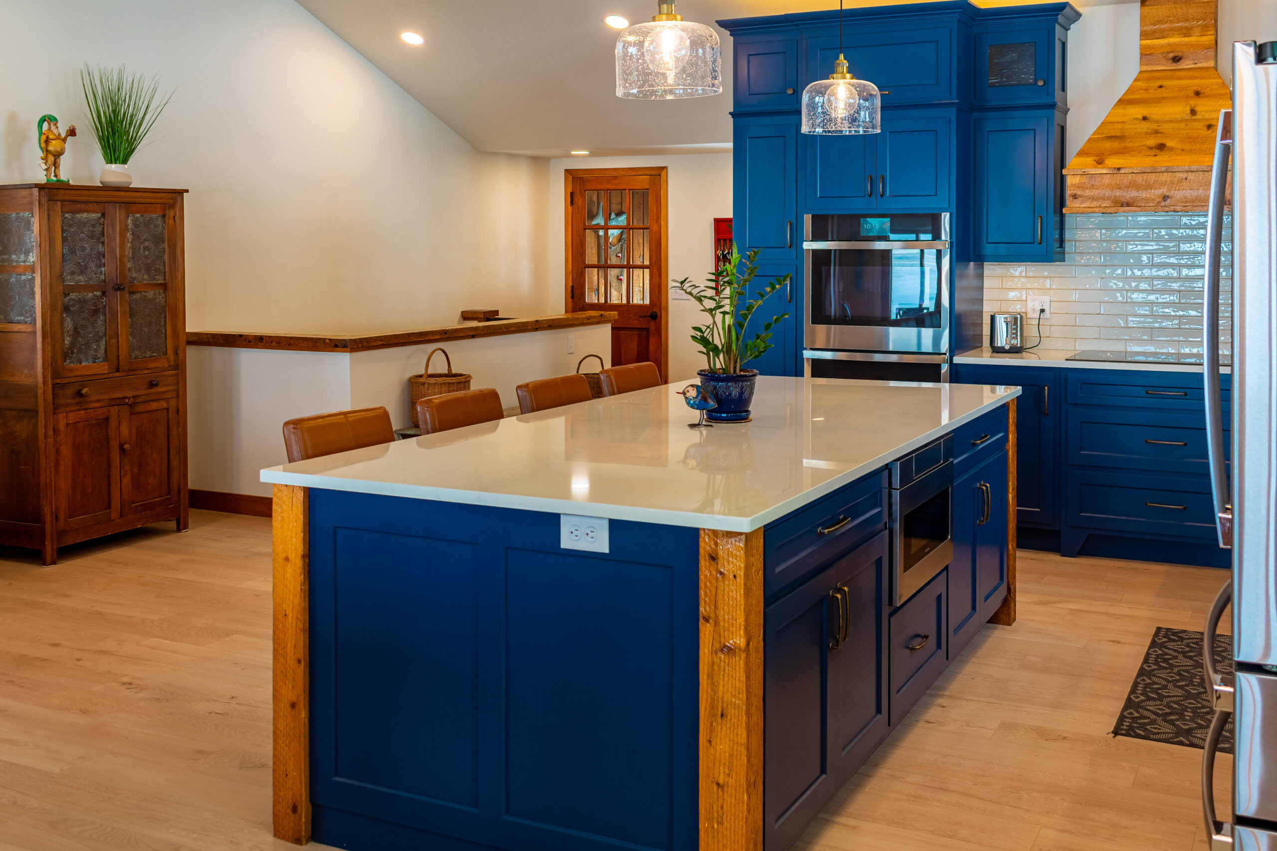 At the heart of the home is a rich material palette—highlighted by wood salvaged from a 100+ year-old family farm. Carefully restored and integrated throughout, these elements carry forward a sense of legacy while adding warmth and character to each space. Paired with deep-toned cabinetry, natural stone, and clean finishes, the result is a balanced contrast between old and new.