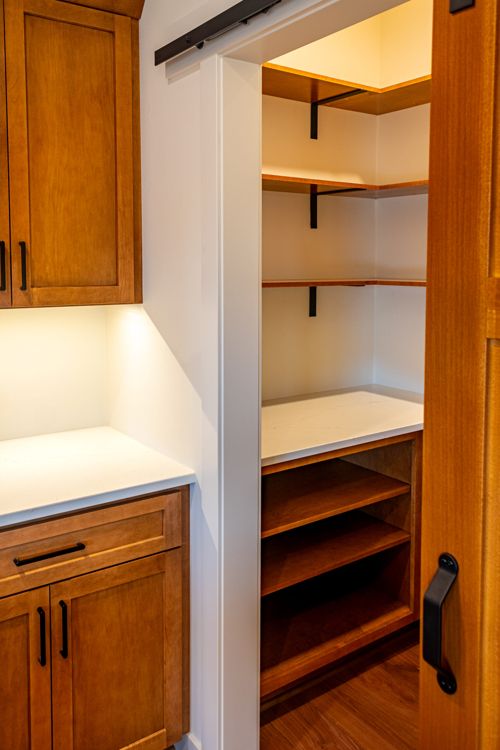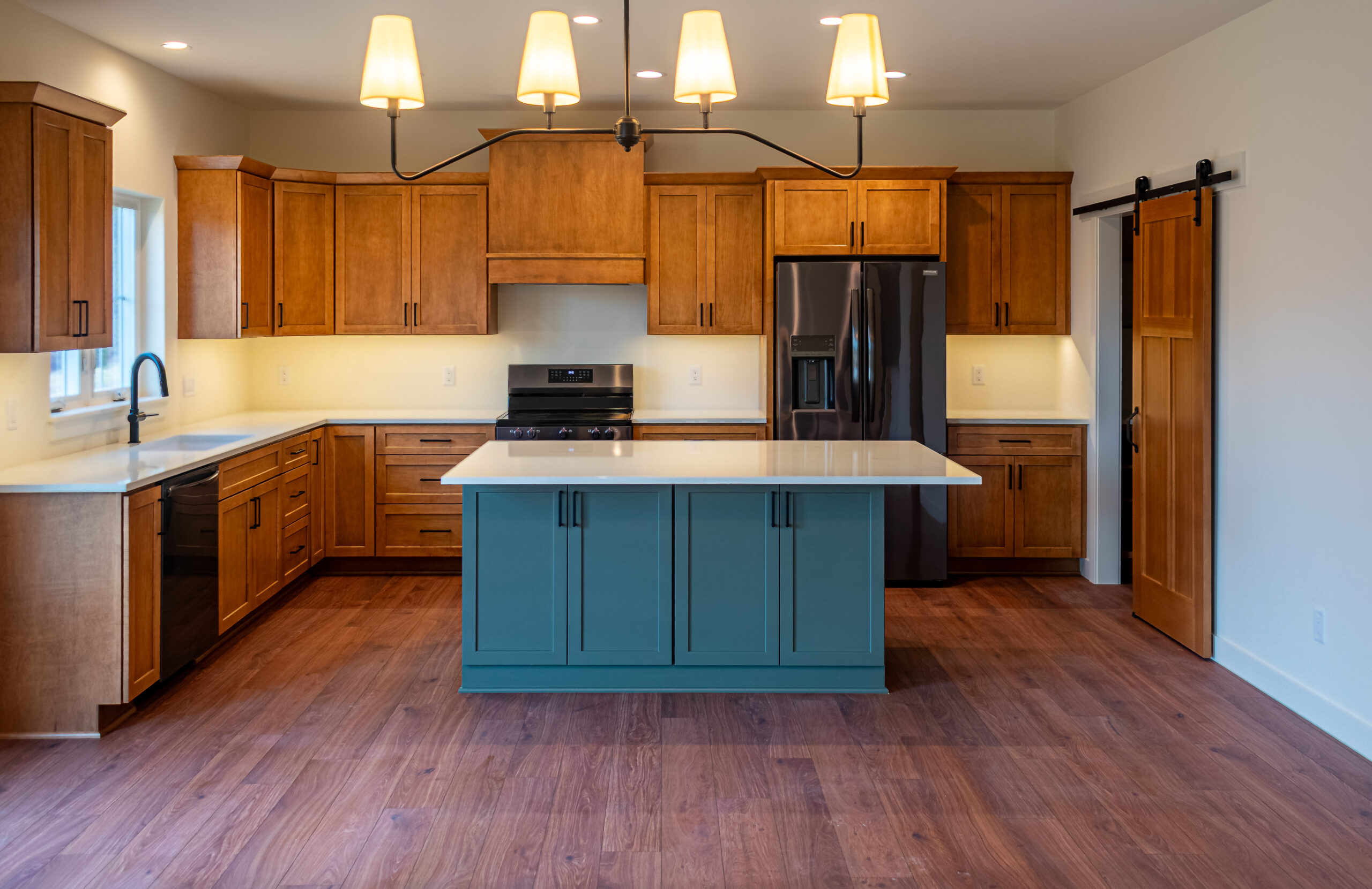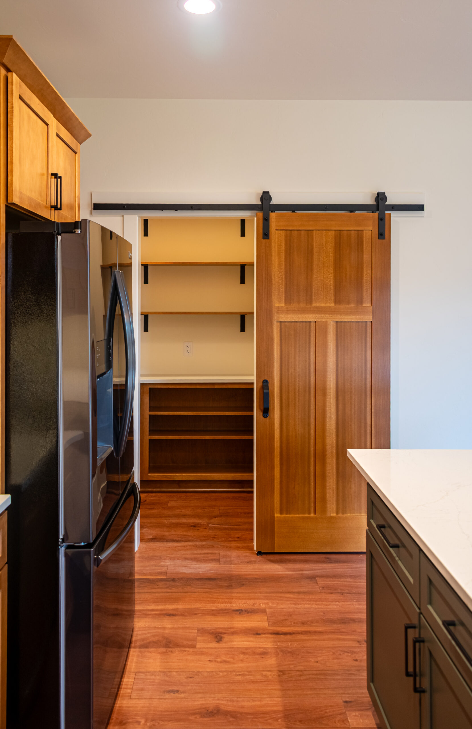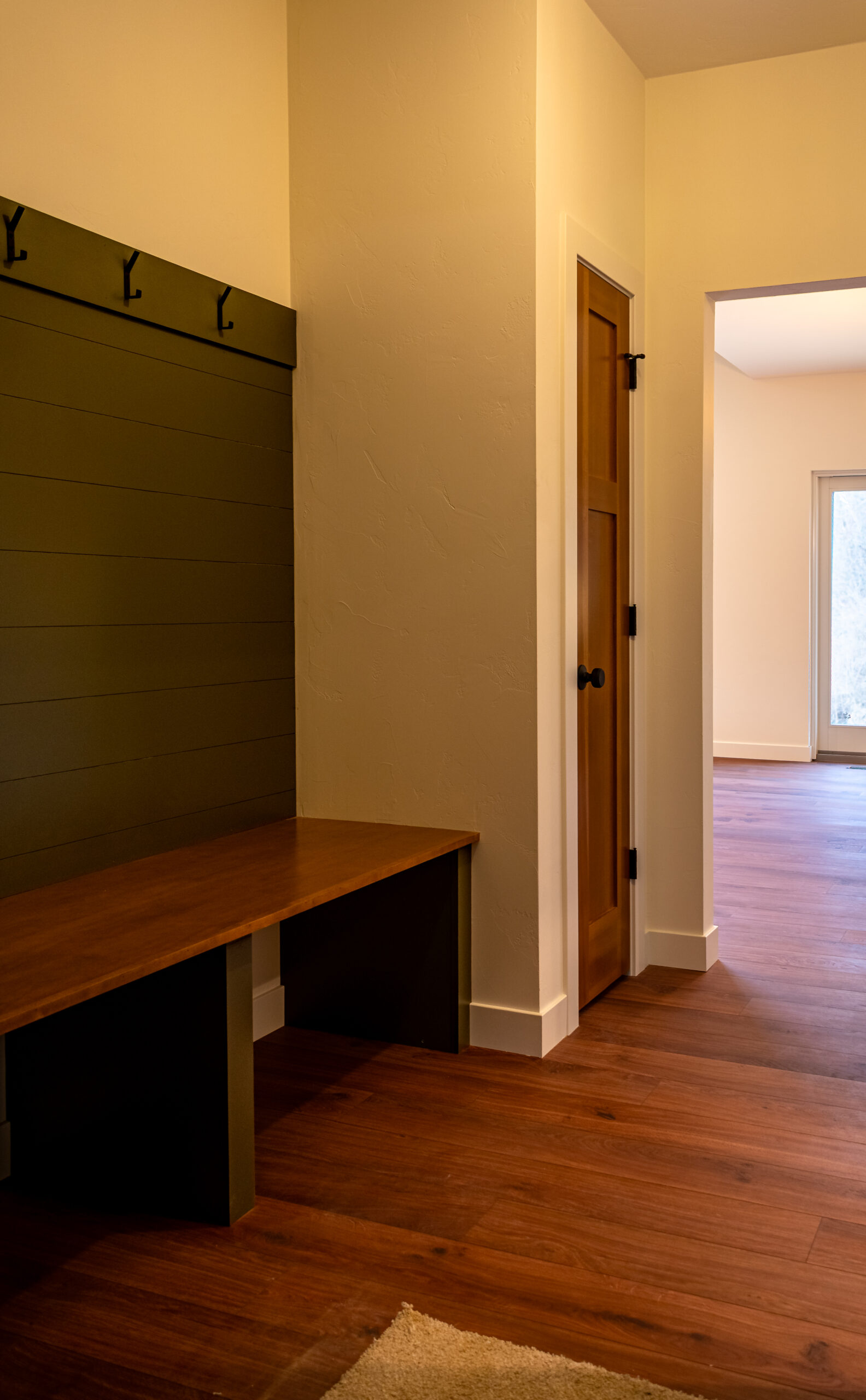 From the moment you enter, the space opens effortlessly, guided by soft transitions and an understated palette. Warm wood tones carry throughout the home, bringing a sense of continuity and calm, while subtle contrasts—like the muted green island and dark hardware—add depth without overwhelming the space.