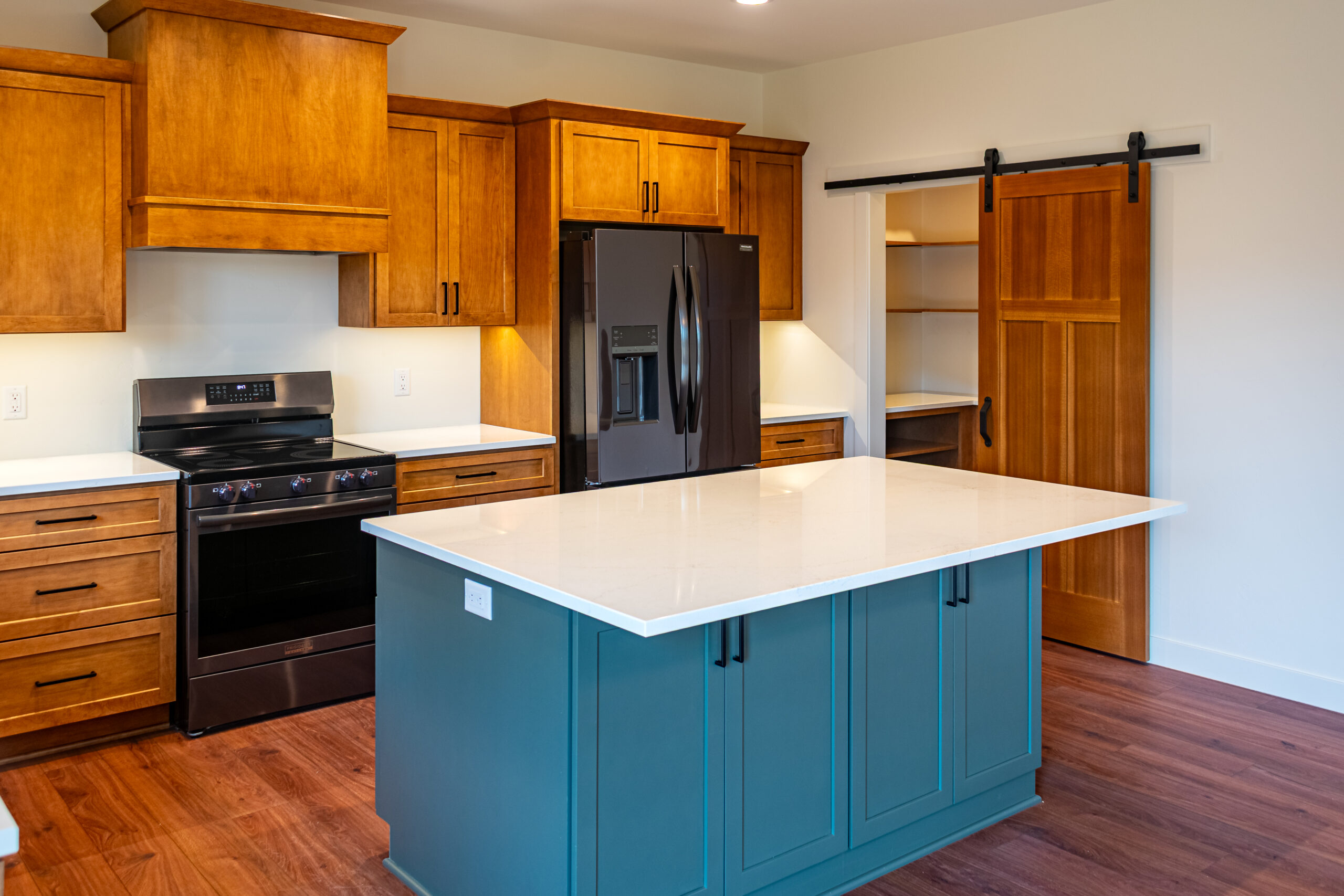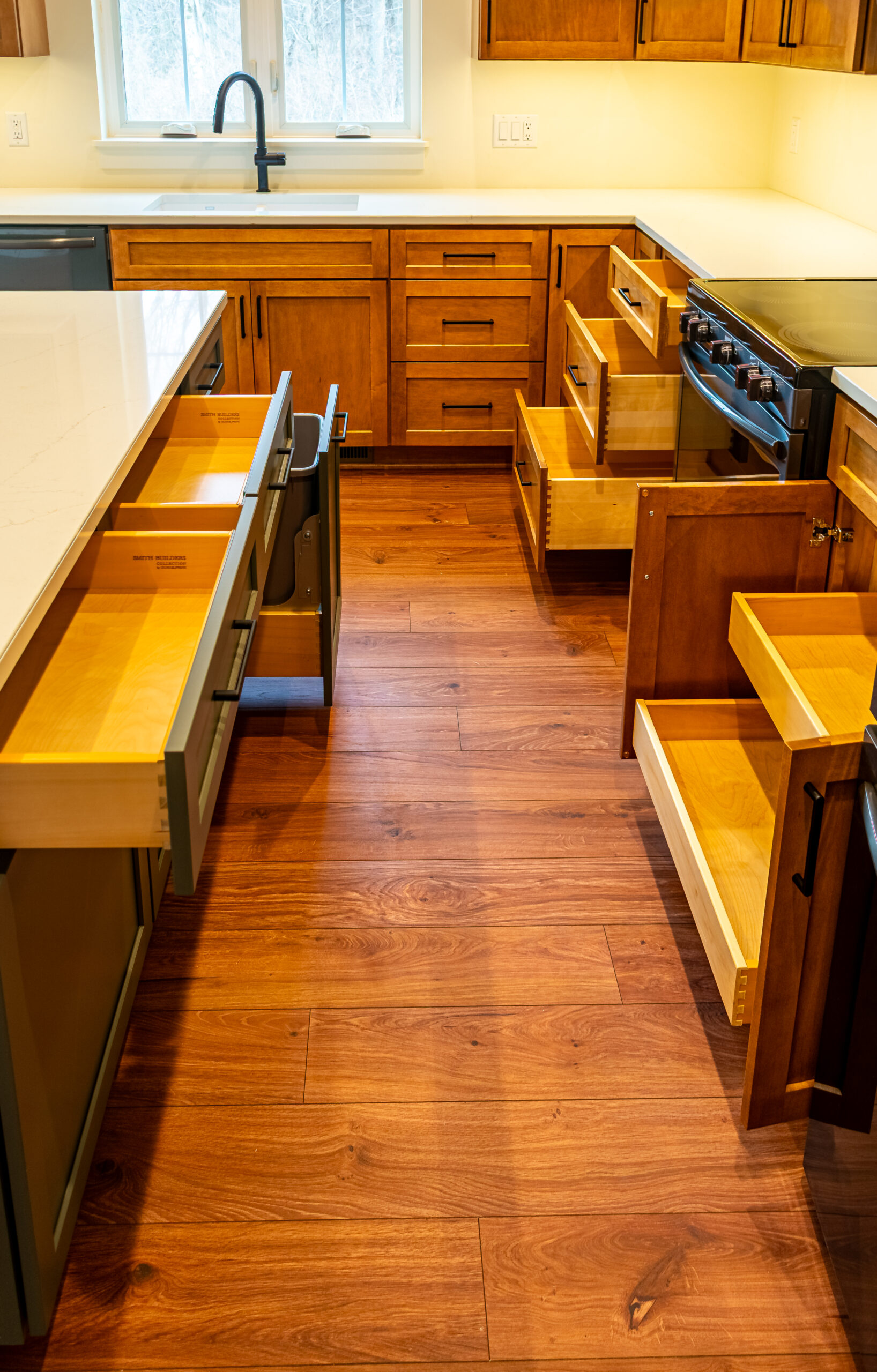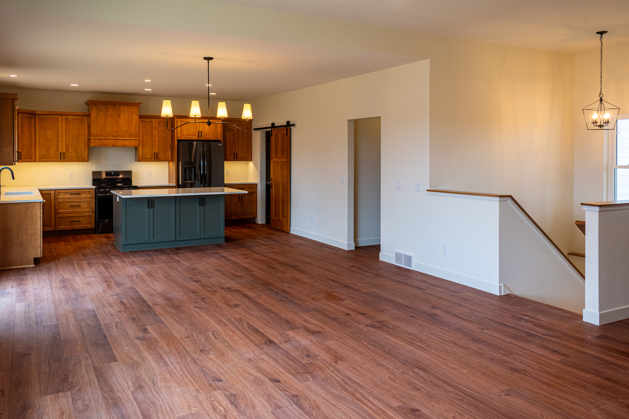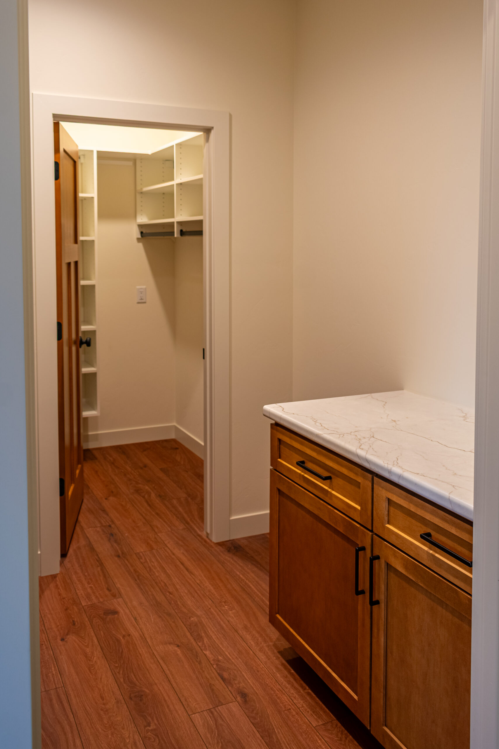 From the moment you enter, the space opens effortlessly, guided by soft transitions and an understated palette. Warm wood tones carry throughout the home, bringing a sense of continuity and calm, while subtle contrasts—like the muted green island and dark hardware—add depth without overwhelming the space.