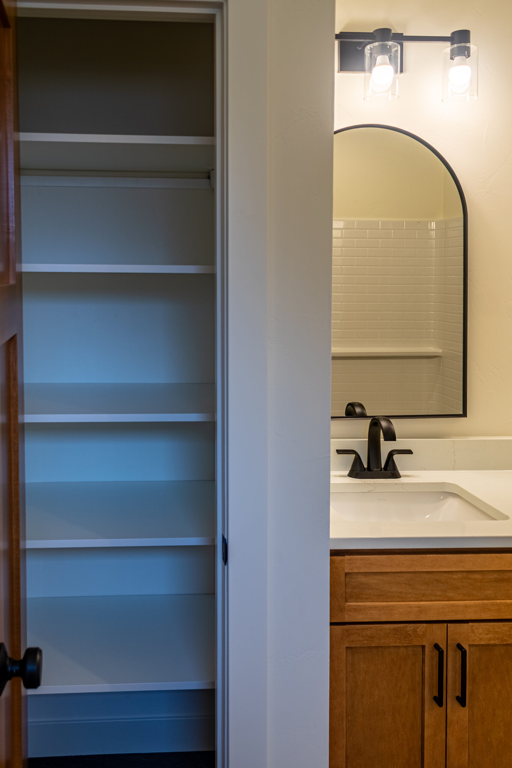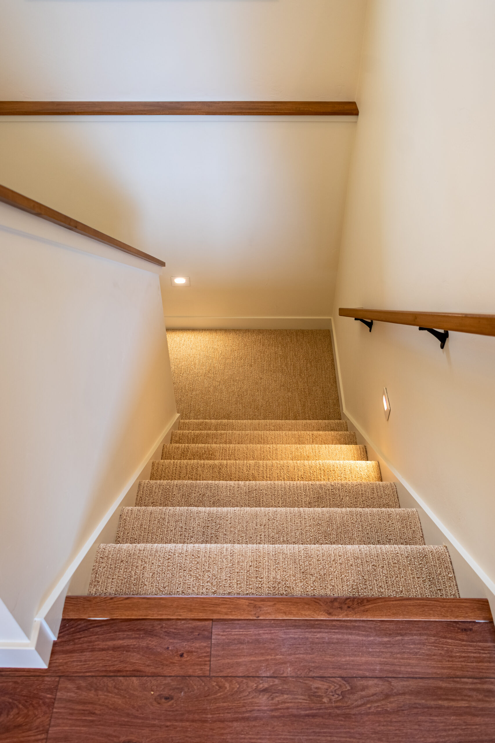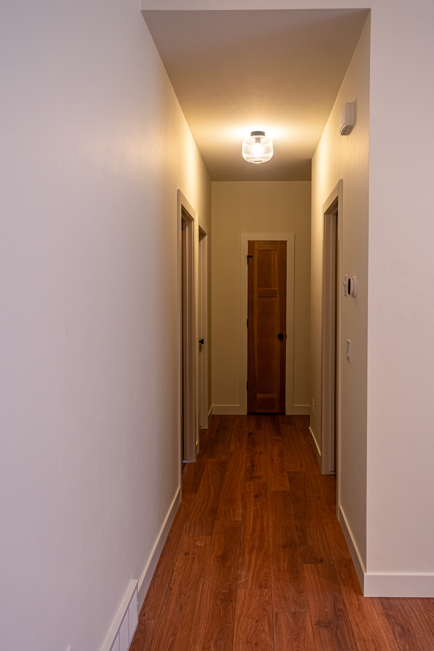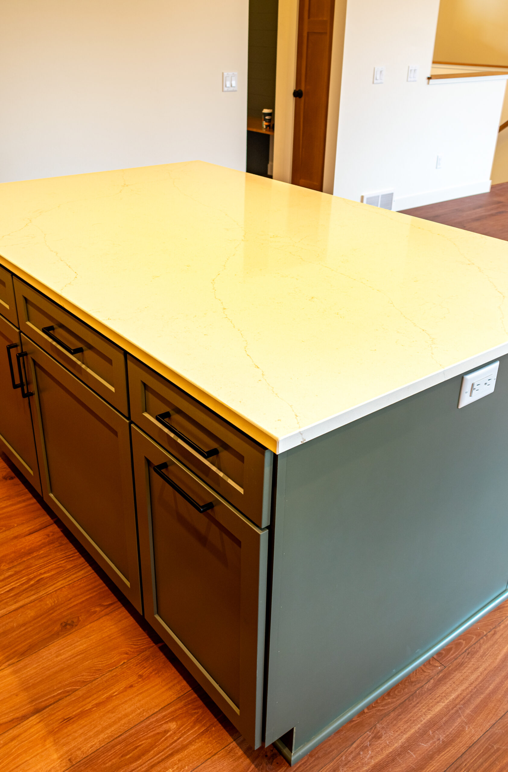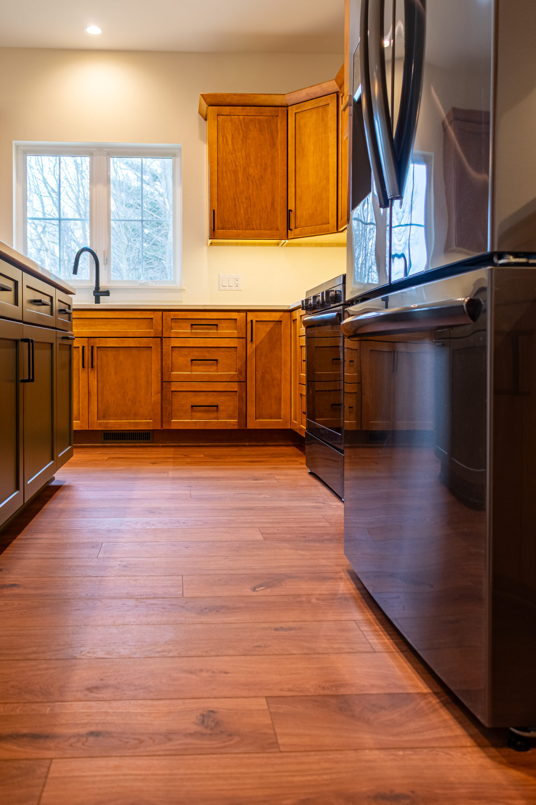 From the moment you enter, the space opens effortlessly, guided by soft transitions and an understated palette. Warm wood tones carry throughout the home, bringing a sense of continuity and calm, while subtle contrasts—like the muted green island and dark hardware—add depth without overwhelming the space.